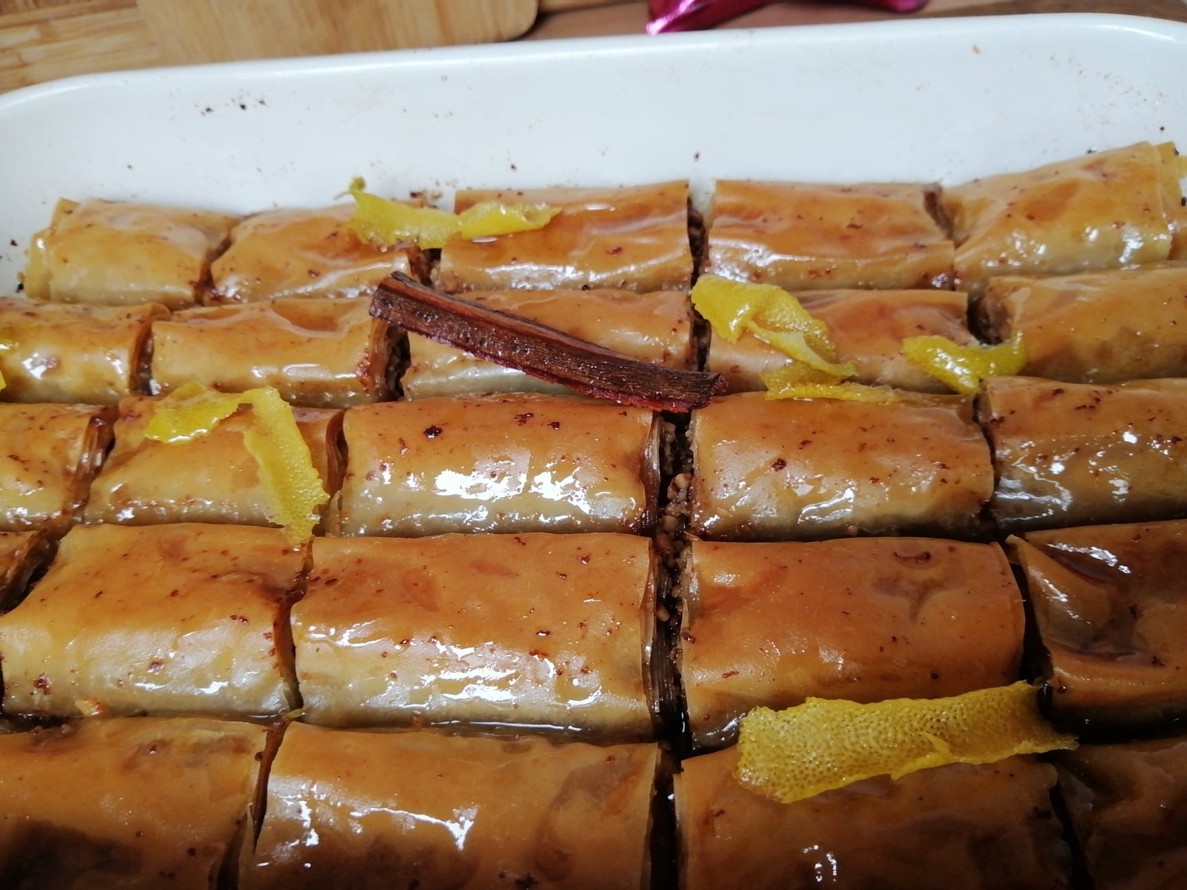 Σε ένα μπλέντερ ή γουδί χτυπάμε την καρυδόψιχα, το φιστίκι, το αμύγδαλο, την κανέλα και το γαρίφαλο. Δεν τα διαλύουμε πολύ να γίνουν σκόνη αλλά δεν θέλουμε και πολύ μεγάλα κομμάτια γιατί θα σπάσουν στη συνέχεια το φύλλο μας.
