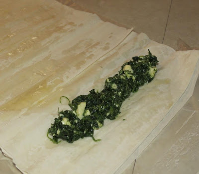 στη συνέχεια τυλίξτε τη ζύμη αρκετά σφιχτά σε σχήμα πούρου ξεκινώντας από το άκρο του σπανακιού, κάνοντας μια πλήρη στροφή, στη συνέχεια γυρίστε και πιέστε τις πλευρές και συνεχίστε να τυλίγεται. Βουρτσίστε την επιφάνεια με λάδι.