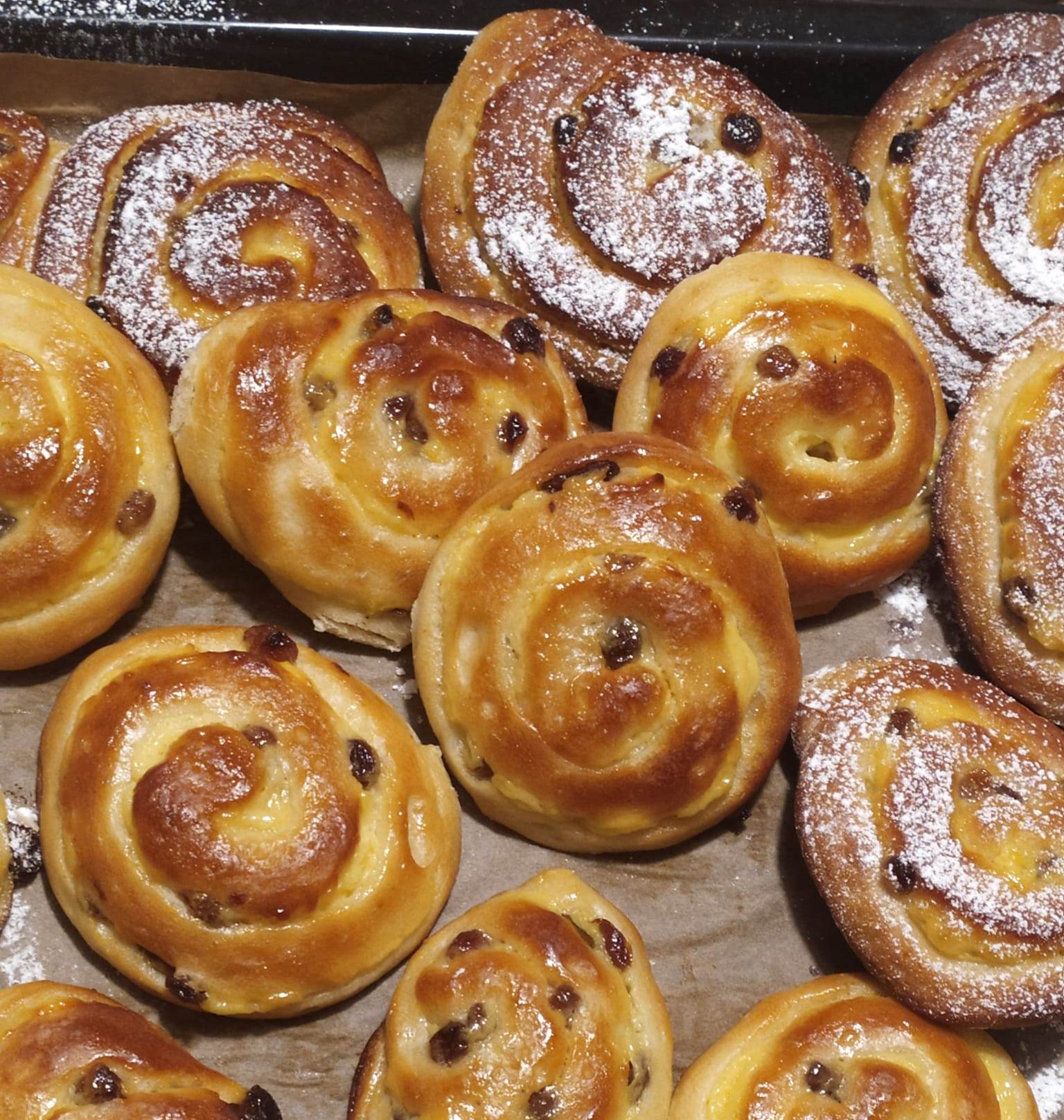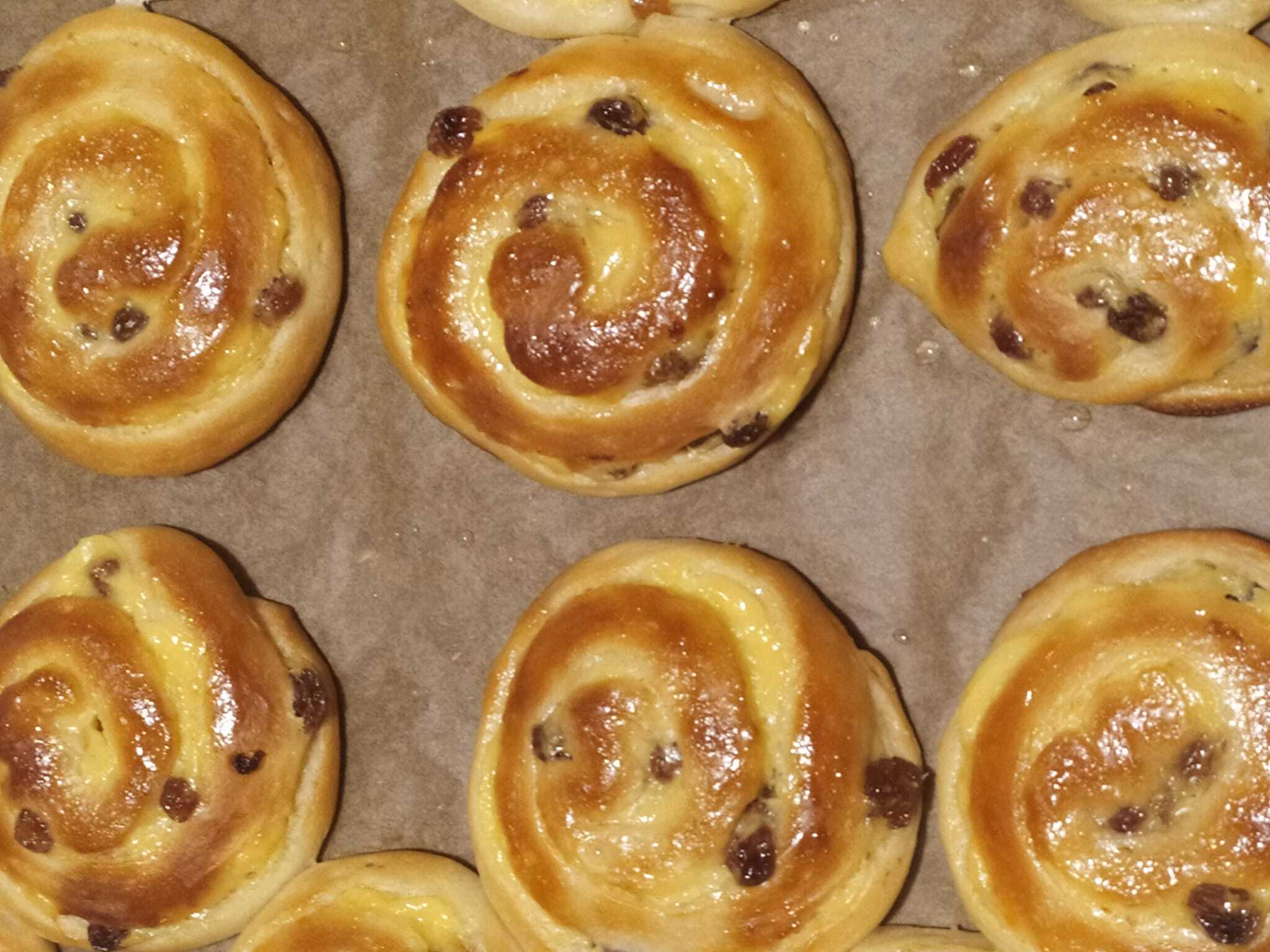 Μετά από δύο ώρες ανοίγουμε τη ζύμη, μοιράζουμε από πάνω την κρέμα και τις σταφίδες