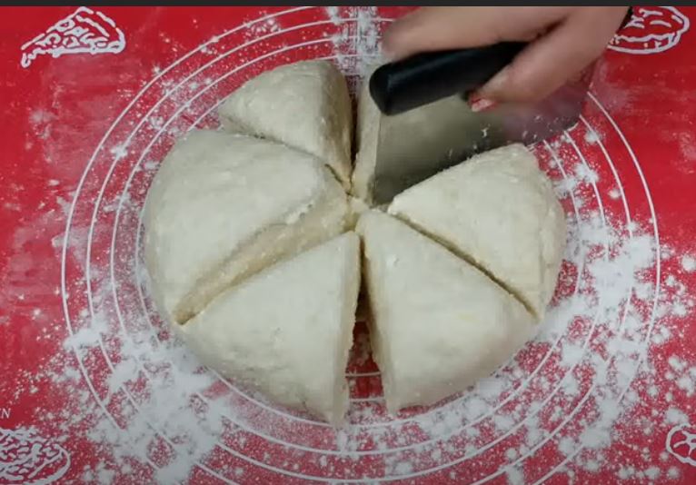 Πασπαλίζω πάλι τον πάγκο μου με αλεύρι, βγάζω τη ζύμη από το ψυγείο και τη χωρίζω σε 6 κομμάτια.