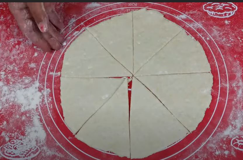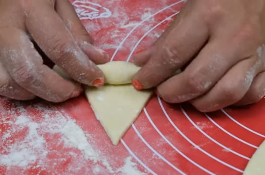 Χωρίζω το φύλλο σε **8 κομμάτια τριγωνάκια** και τα τυλίγω σε **ρολάκι** από τη φαρδιά πλευρά προς τη μύτη.
