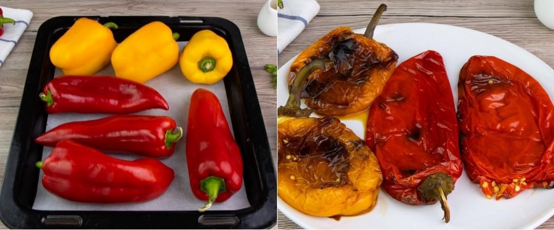 Πλένουμε καλά τις πιπεριές και τις τοποθετούμε σε ταψί καλυμμένο με λαδόκολλα, τις ψήνουμε στους 200° για περίπου 40 λεπτά, γυρίζοντάς τις κατά διαστήματα.