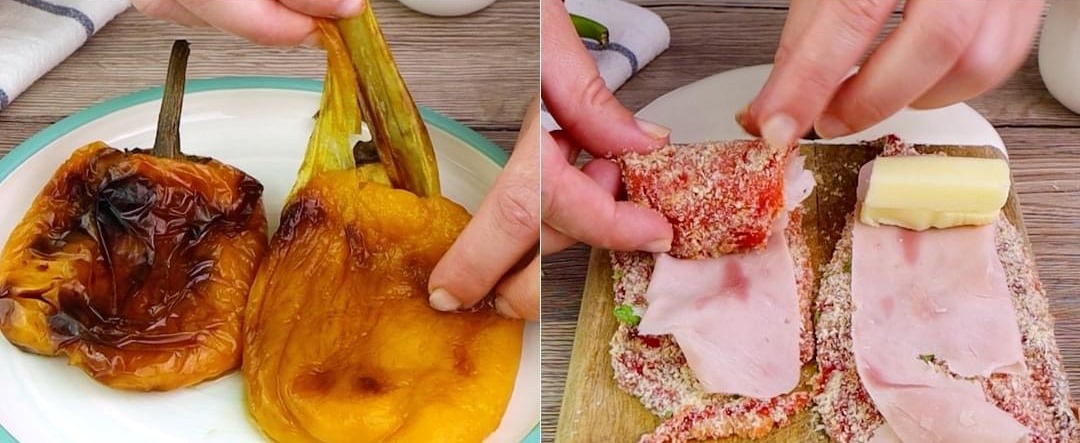 Σε κάθε φέτα πιπεριάς βάζετε μισή φέτα μαγειρεμένο ζαμπόν και μερικά κομμάτια τυρί, μπορείτε να χρησιμοποιήσετε ότι κιτρινο τυρί σ αρεσει, το σημαντικό είναι να είναι μαλακό τυρί.