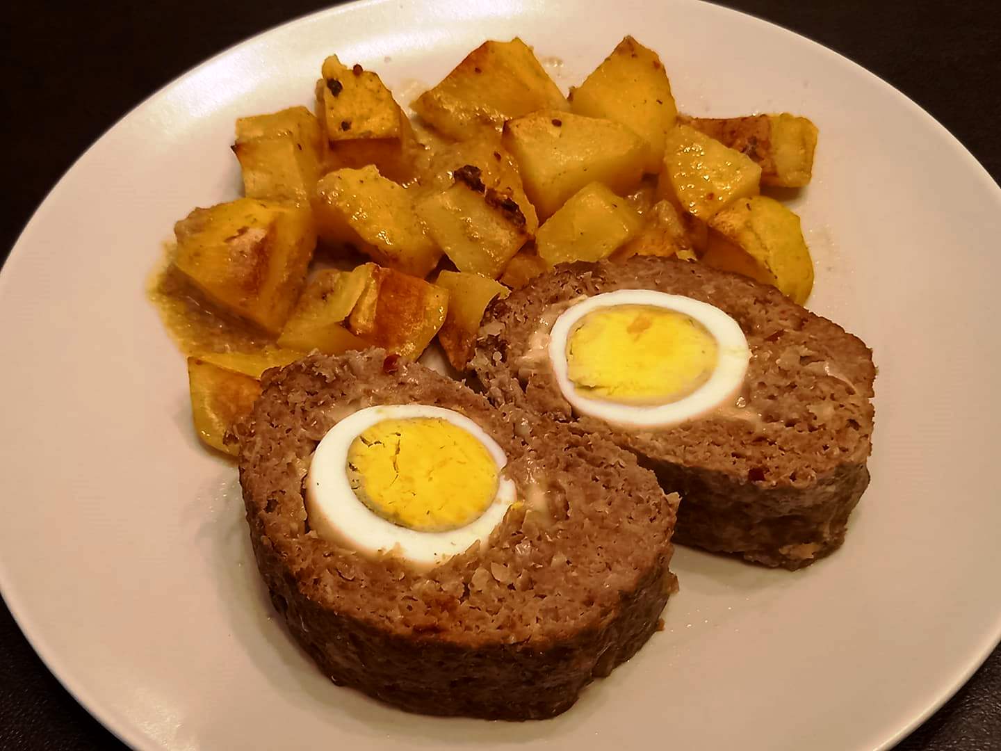 Ζυμώνουμε καλά μέχρι να ομογενοποιηθεί το μείγμα τον πλάθουμε σε μία λαδόκολλα τον ανοίγουμε και του δίνουμε ένα ορθογώνιο σχήμα. Τοποθετούμε στο κέντρο στη σειρά καθαρισμένα τα βραστά αυγά