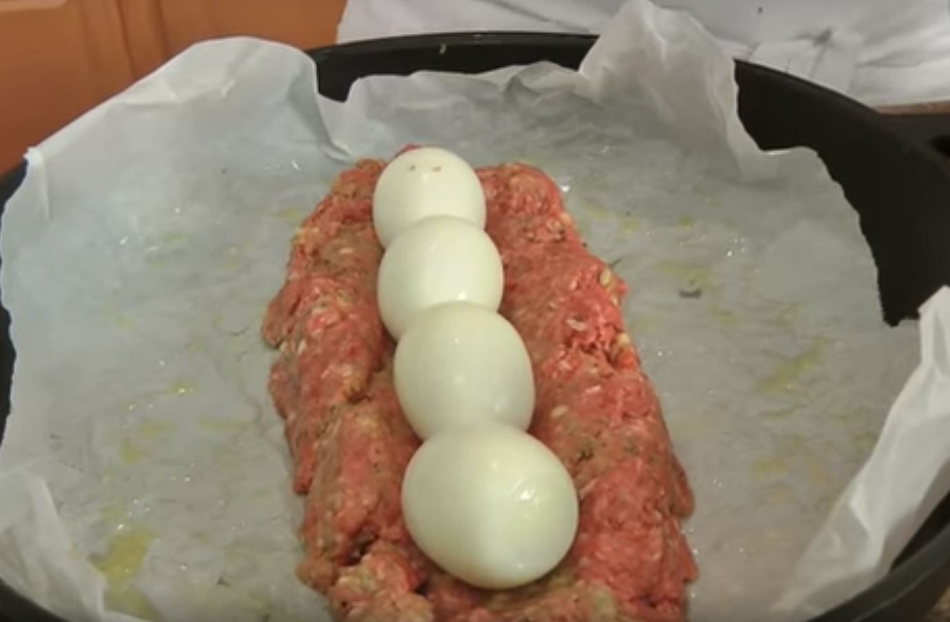 3) Ανακατέψτε τα πάντα μαζί καλά και στη συνέχεια φτιάξτε το ρολό (μεσα στο προετοιμασμένο ταψι σας). Τοποθετήστε τα σκληρά βρασμένα αυγά κατά μήκος του κέντρου (δείτε την φωτό),