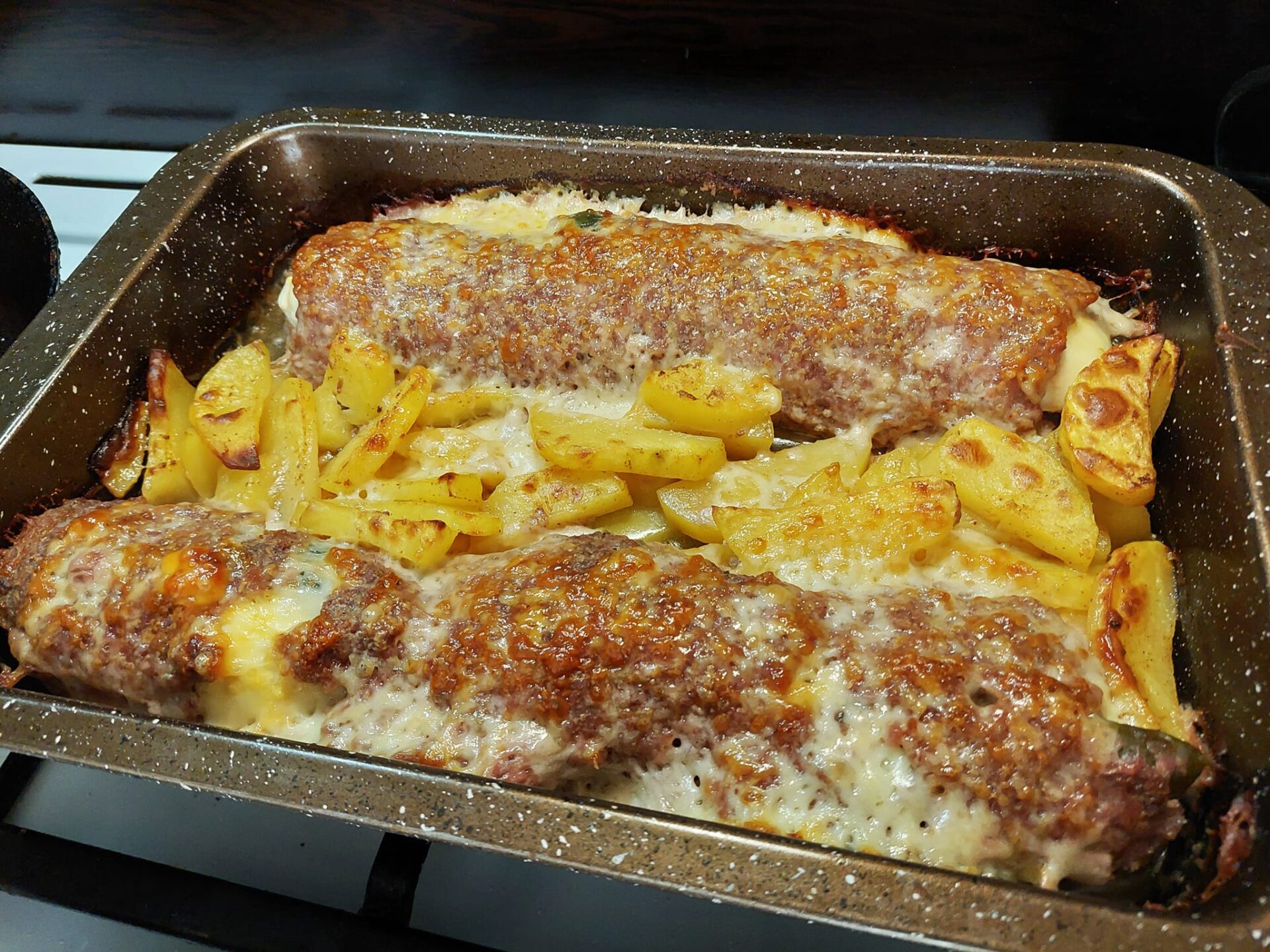 Βάζω τα δυο ρολά σε ταψί, τακτοποιώ τις κυδωνάτες πατάτες γύρω από τα ρολά και ζεστό νερό. Ραντίζω με ελαιόλαδο και ψήνω το φαγητό στους **220 βαθμούς** περίπου **μία και μισή ώρα**, ώσπου να ψηθούν ρολά και πατάτες.