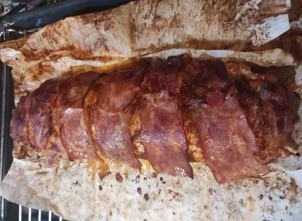 Στη συνέχεια σε μία λαδόκολλα στρώνουμε τις φέτες του μπέικον βάζουμε πάνω το ρόλο και το τυλίγουμε με τη βοήθεια κατά του χαρτιού.