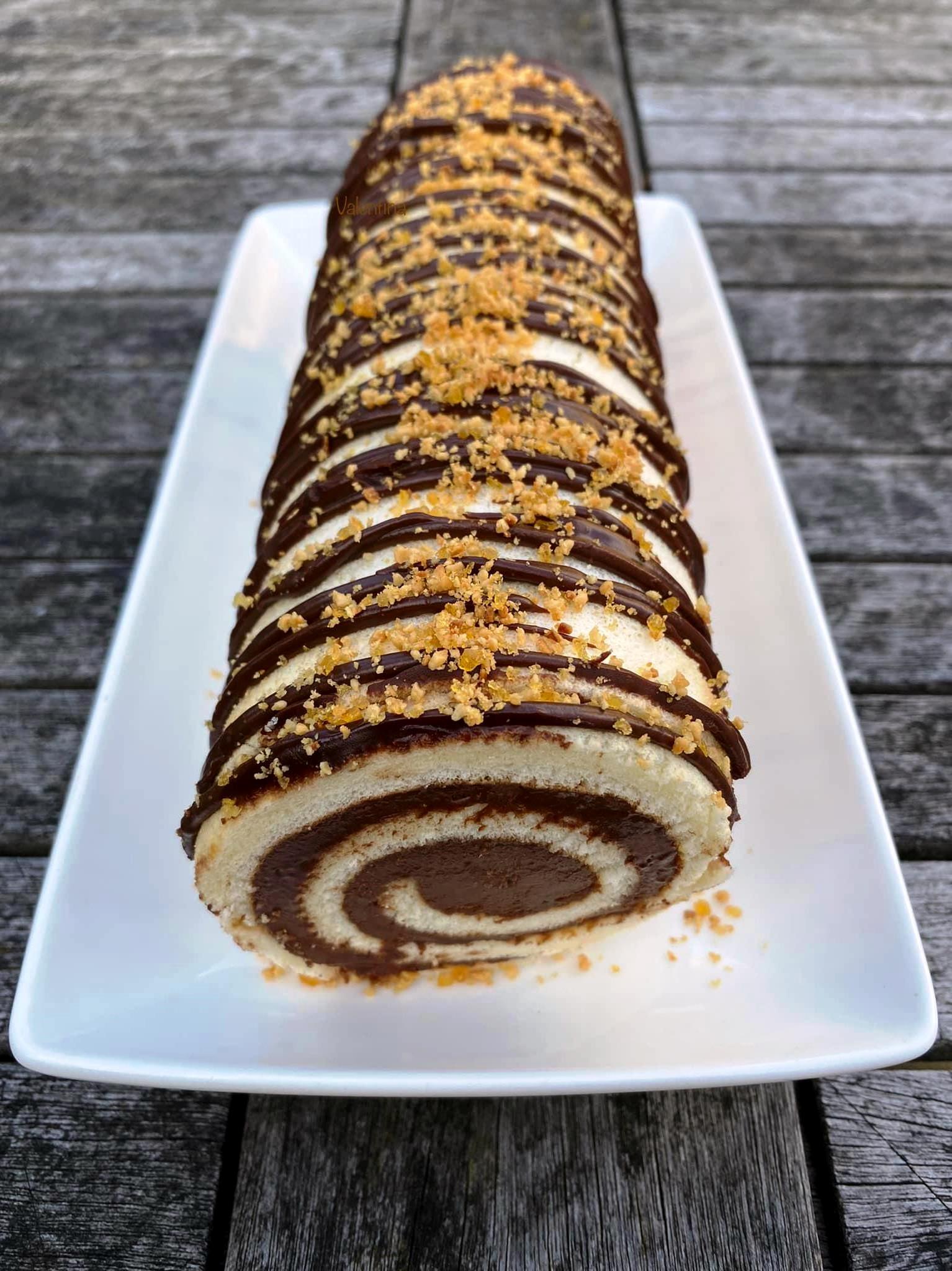 Έφτιαξα κρέμα από 150 γρ μασκαρπόνε και 7 κουταλιές της σούπας γκανάζ σοκολάτας. Άπλωσα το μειγμα στο κρυωμένο παντεσπανι το τυλίγω σε ρολό και βάζω στο ψυγείο για 3-4 ώρες. Πασπάλισα με γκανάζ σοκολάτας και κροκάν.