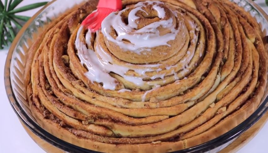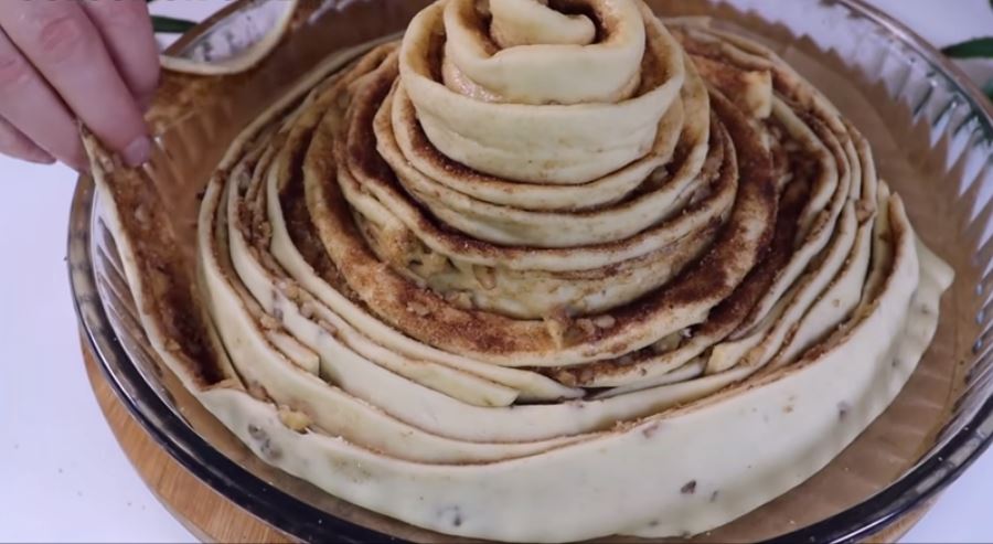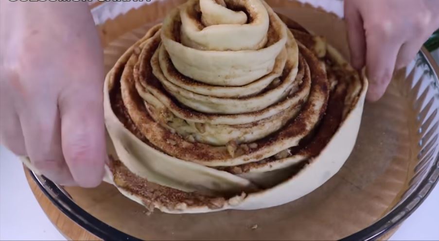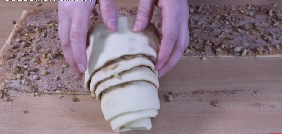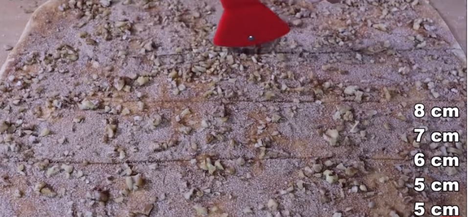 Απλώνουμε το μισό βούτυρο από τα 70.γρ. Ρίχνουμε στην επιφάνεια το μισό μείγμα κανέλας ζάχαρης και τα μισά καρύδια.