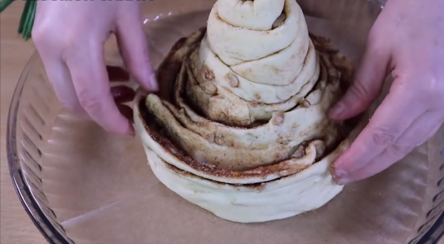 Φτιάχνουμε ένα σχήμα κώνου και τον τοποθετούμε σε στρογγυλό πυρέξ στο οποίο έχουμε βάλει αντικολλητικό χαρτί.