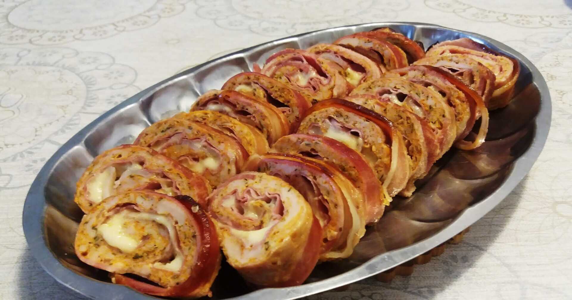 2. Κόψτε δύο μεγαλα κομμάτια αλουμινόχαρτου. Στη στενή πλευρά του αλουμινόχαρτου, τακτοποιήστε, κατά μήκος, 4-5 φέτες μπέικον (οι φέτες πρέπει να είναι πιο φαρδιές), αλλά έτσι ώστε κάθε φέτα να επικαλύπτει ελαφρώς την προηγούμενη φέτα μπέικον. Τοποθετήστε το μπέικον και στα δύο κομμάτια αλουμινόχαρτου. Βάλτε το έτοιμο ρολο πάνω από το μπέικον, τη μισή ποσότητα και από τις δύο πλευρές. Απλώνουμε με κουτάλι τον κιμά σε όλη την επιφάνεια, αλλά στο τέλος αφήνουμε περίπου 5 εκατοστά χωρίς γέμιση. Τοποθετήστε το ζαμπον (50 γραμμάρια και από τις δύο πλευρές) πάνω από τον κιμά. Τέλος, μοιράστε τη μισή ποσότητα τριμμένου τυριού.
