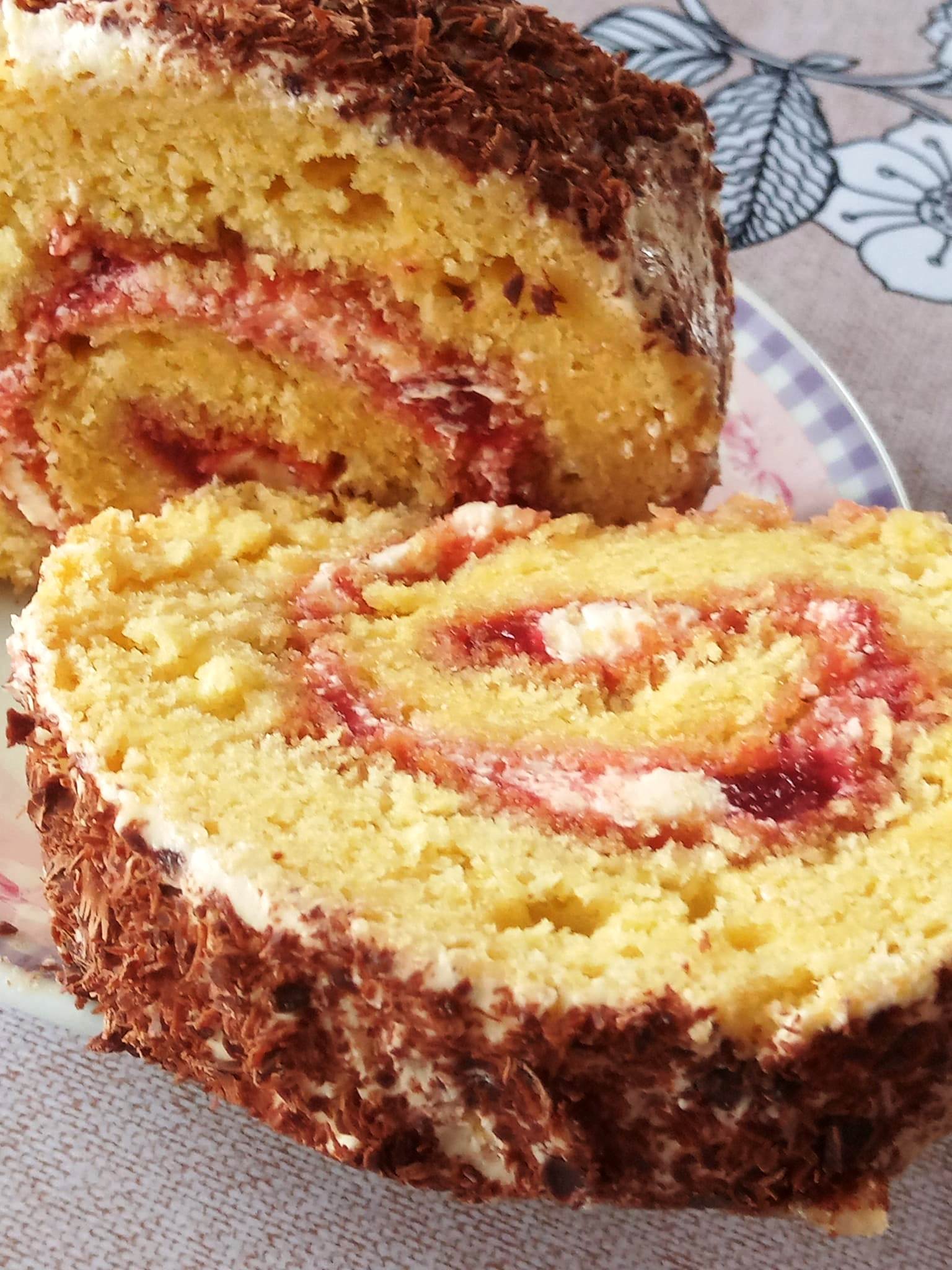 Το ρολό είναι πολύ νόστιμο, τρυφερό, μέτρια γλυκό, υγρό, δεν σκάει, όμορφα κομμένο, με ντελικάτη κρέμα και βύσσινο…..