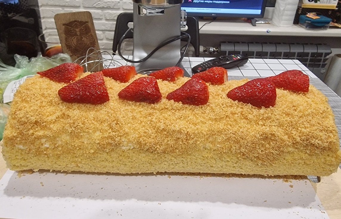Χτυπήστε το μπλεντερ τα περισευματα απο το παντεσπανι αλειψτε το ρολό με κρεμα και πασπαλίστε με το τριμμα διακοσμήστε με επιπλέον φράουλες πριν το σερβίρισμα.