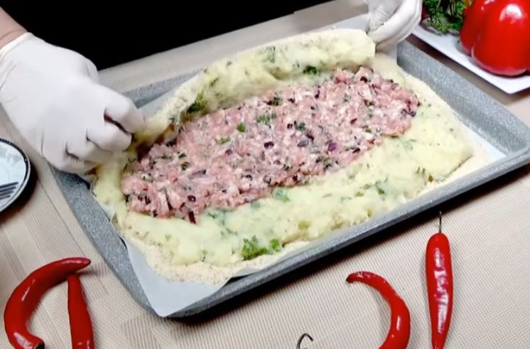 Τοποθετούμε το μείγμα του κιμά πάνω απο το μείγμα της πατάτας.