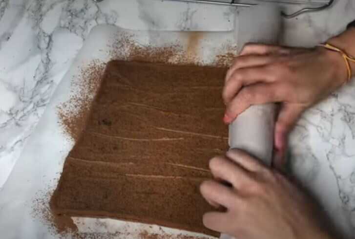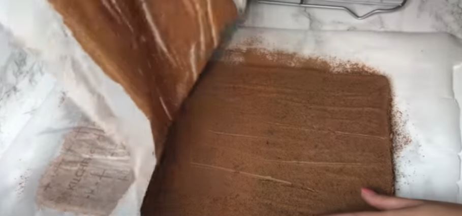 Πασπαλίζουμε ένα νέο χαρτί ψησίματος με σκόνη κακάο καλά και εκεί επάνω γυρίζουμε το παντεσπάνι και αφαιρούμε το χαρτί με το οποίο ήταν στο φούρνο.