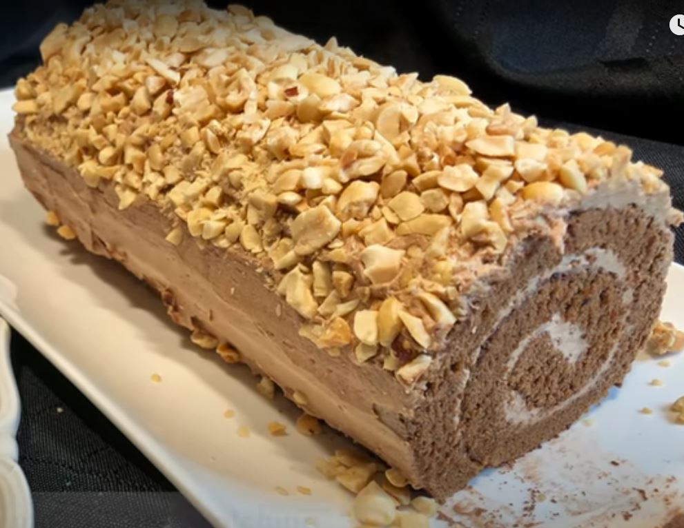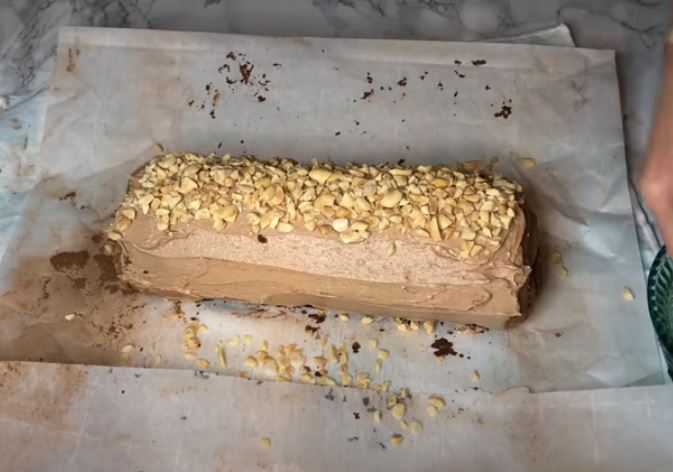 Βγάλτε από το ψυγείο το ρολό, απλώστε 2-3 στρώματα κρέμα από πάνω και γύρω του και πασπαλίστε με φιστίκι.