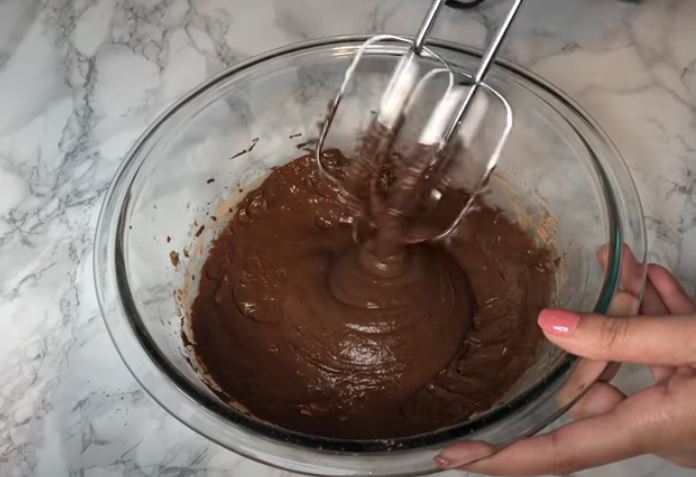 Στην συνέχεια τα χτυπάμε με το μίξερ χειρός και θα περιμένουμε να πάρουμε ένα σοκολατένιο μείγμα.