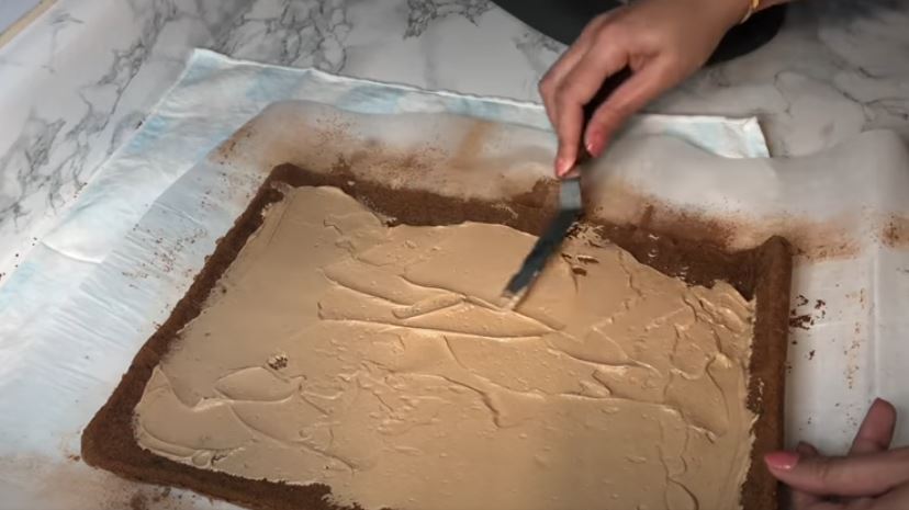 Ξετυλίγομαι το παντεσπάνι, αλείφουμε την κρέμα (μία στρώση)