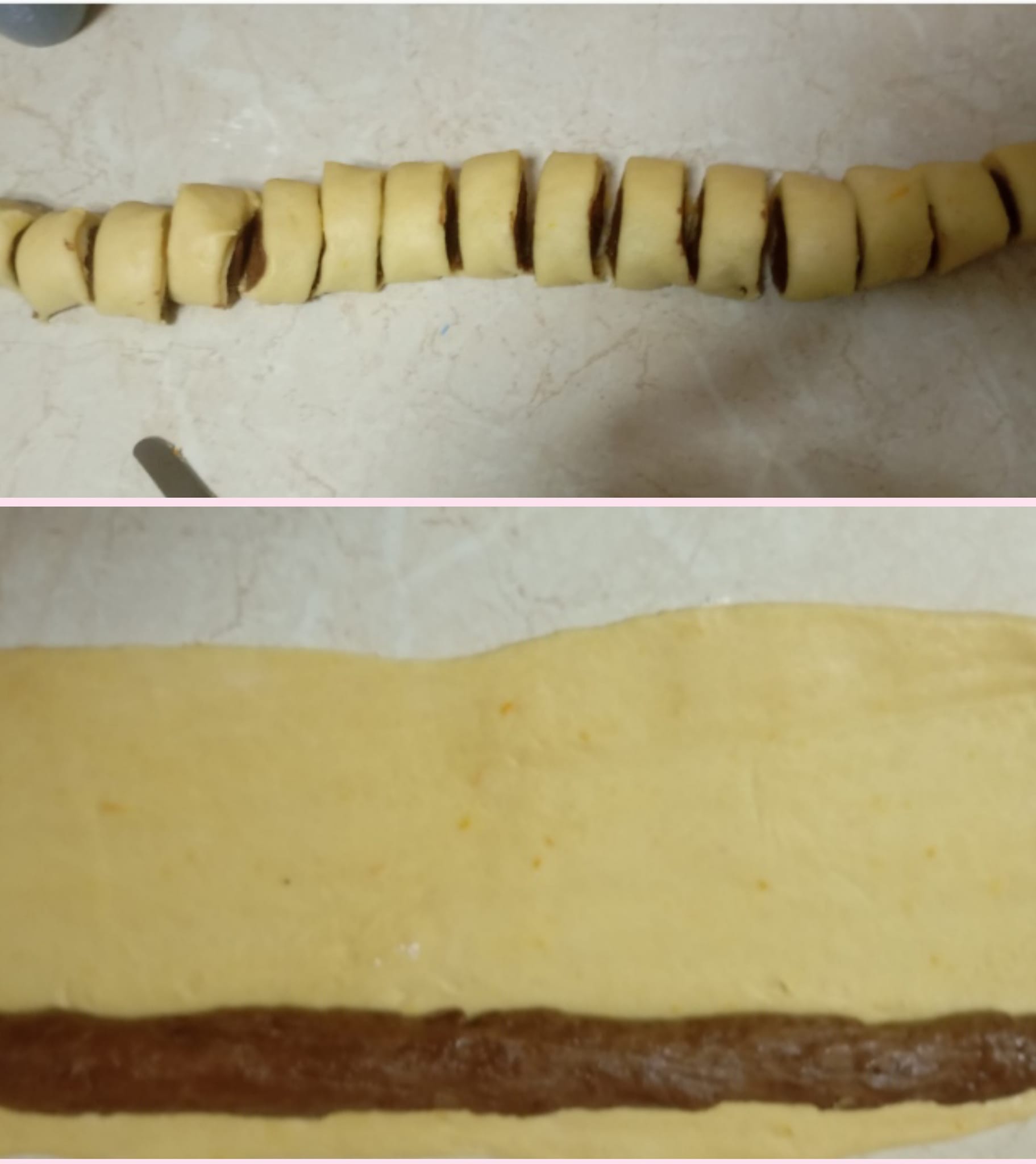 Χωρίζουμε παλι τη ζύμη στα τρια. Ανοίγουμε τη λευκη σε παραληλόγραμα και πλάθουμε κορδονια με την καφε.