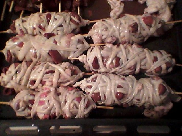 Παίρνουμε ένα μεγάλο ξυλάκι για σουβλάκι. Όχι από την πλευρά της μύτης αλλά από την αντίθετη πλευρά, περνούμε το έντερο, όχι εντελώς στην άκρη του αλλά λίγο πιο μέσα και σπρώχνουμε την εξωτερική επιφάνεια του εντέρου προς τα μέσα. Με αυτό τον τρόπο θα γυρίσουμε το έντερο έτσι ώστε η εσωτερική επιφάνεια να βγει απ’ την έξω πλευρά. Αν βρούμε έντερα έτοιμα καθαρισμένα αποφεύγουμε τη διαδικασία του καθαρίσματος των εντέρων.