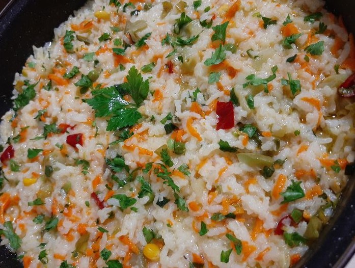 Για να μην σκάσει, αλλά για να παραμείνει τραγανό, το ρύζι πλένεται με κρύο νερό μέχρι το νερό να αρχίσει να παραμένει καθαρό. Ρίξτε ζεστό νερό ή ζωμό. Ανακατεύουμε μόνο στην αρχή του μαγειρέματος (για να μην κολλήσει στον πάτο του τηγανιού)