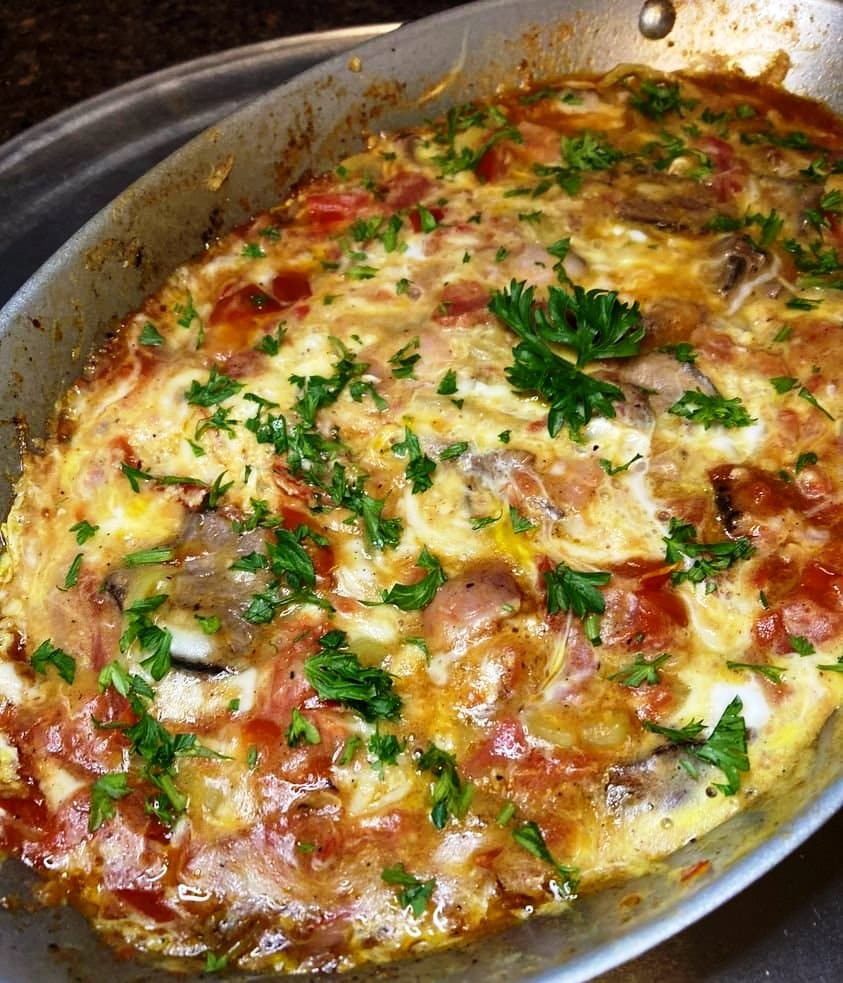 Προσθέστε τα χτυπημενα αυγά και την τριμμένη μοτσαρελα και μαγειρέψτε για λίγο, ανακατεύοντας απαλά όσο χρειάζεται, μέχρι να δέσουν τα αυγά. Διπλώστε το μείγμα ντομάτας στα αυγά. Μόλις είναι ετοιμο διακοσμίστε με ψιλοκομένο μαιντανό