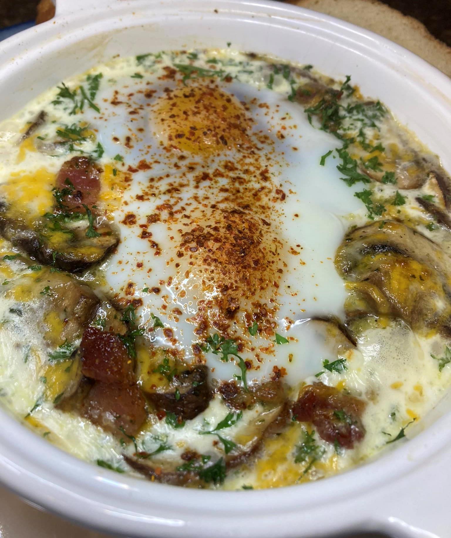 Σε ένα πυρίμαχο σκεύος βάζετε 2 φέτες ψημένο μπέικον ψιλοκομμένο, 1 1/2 φλιτζάνι μανιτάρια σοταρισμένα, 1/2 φλιτζάνι τυρί και ανακατεύετε.