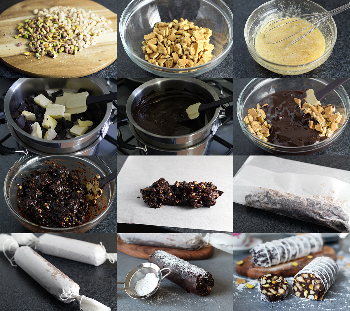 Ξετυλίξτε τους κορμούς και πασπαλίστε με ζάχαρη άχνη. Μπορείτε να τα δέσετε σαν ένα πραγματικό σαλάμι με σχοινή (υπάρχουν πολλές οδηγίες στο Youtube) ή απλά αφήστε το. Κόψτε σε φέτες και σερβίρετε.