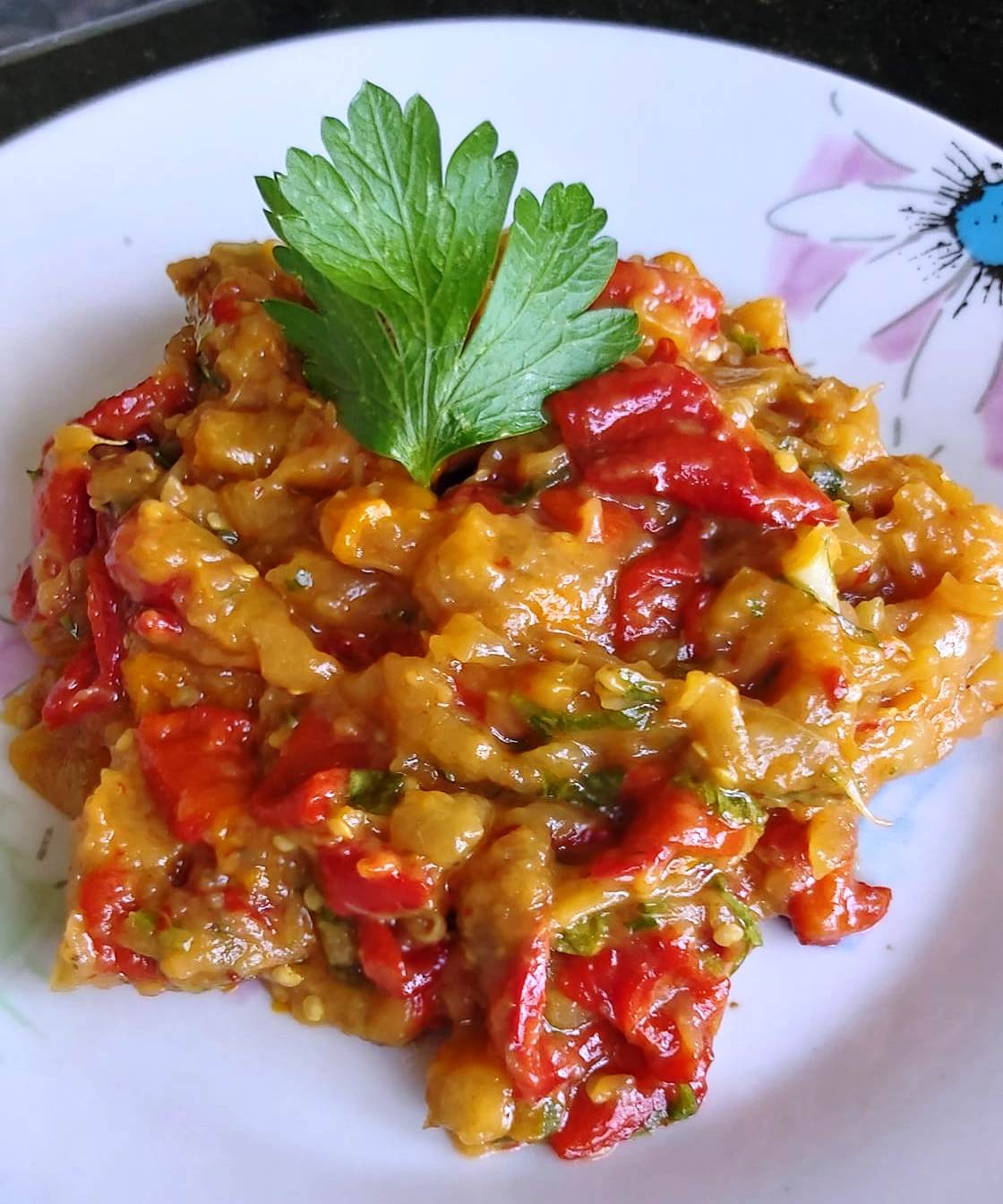 Τα λαχανικά ψήνονται, ξεφλουδίζονται και τεμαχίζονται, αφήνοντας τη μελιτζάνα ξεχωριστά από την πιπεριά.