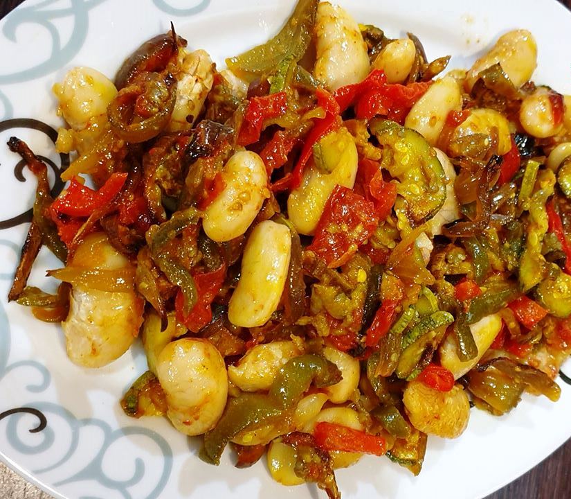 Ανακατεύουμε όλα τα υλικά μαζί εκτος από τους γιγαντες, τα ριχνουμε σε ένα ταψί με λαδόκολλα και ψήνουμε σε προθερμασμένο φούρνο στους 170° για 30 λεπτά στον αέρα….