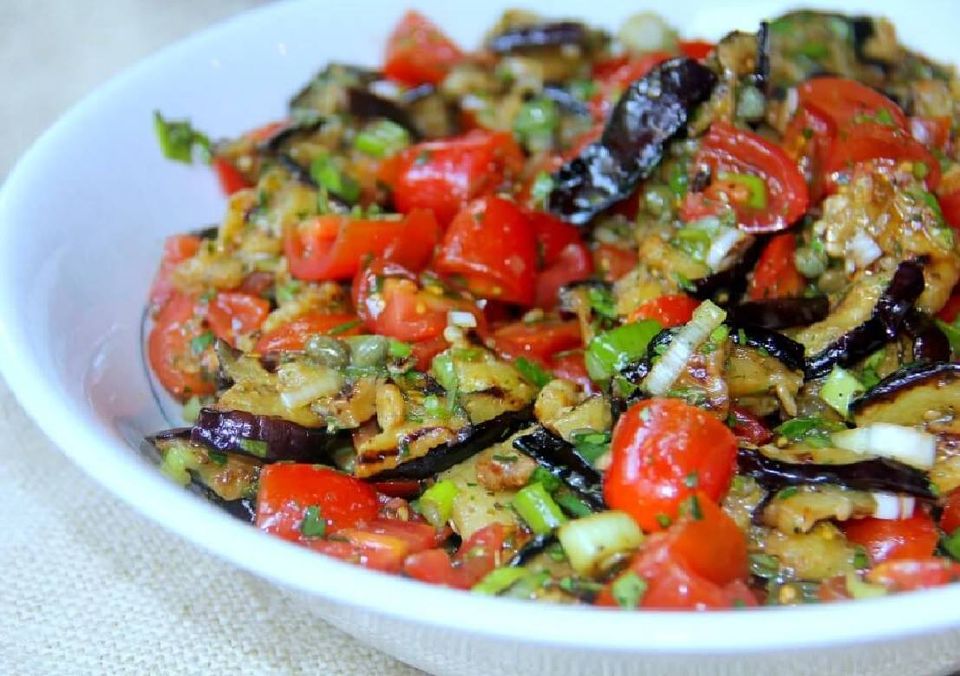 Μια υγιεινή και ελαφριά σαλάτα φτιαγμένη με φρέσκια μελιτζάνα, ντομάτες και πράσινα κρεμμύδια. Αυτό είναι ένα εξαιρετικό πιάτο με γαρίδες στη σχάρα ή κοτόπουλο.