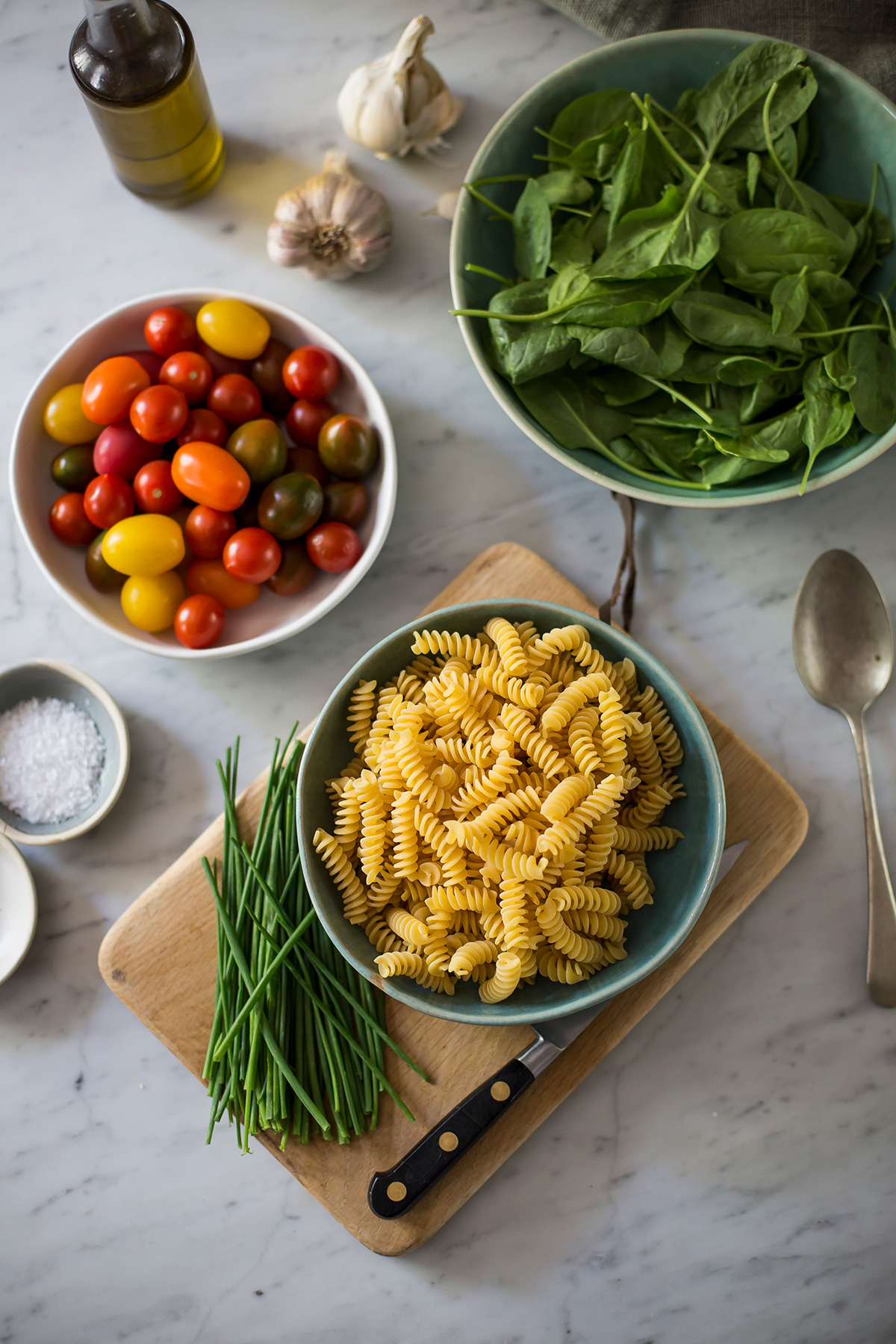 Κόψτε τις ντομάτες στην μέση και το σχοινόπρασο και αφήστε το στην άκρη.