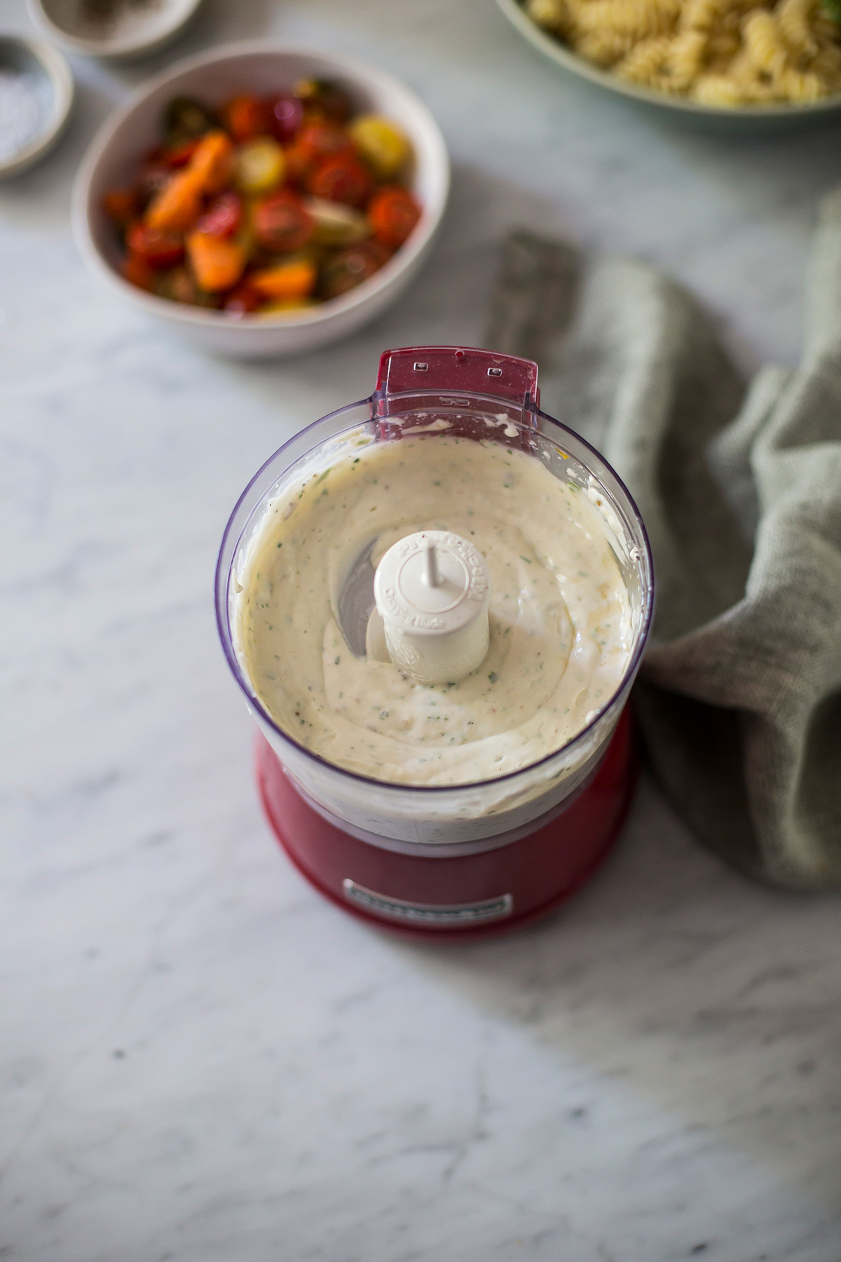 Για να γίνει το dressing βάλτε όλα τα συστατικά σε ένα μικρό επεξεργαστή τροφίμων μέχρι να γίνουν κρέμα.