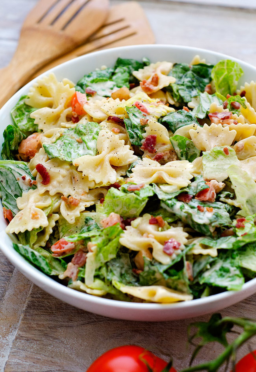 Σε ένα μεγάλο μπολ, συνδυάστε το μαρουλι, τη ντοματα, το μπέικον και τα ζυμαρικά.