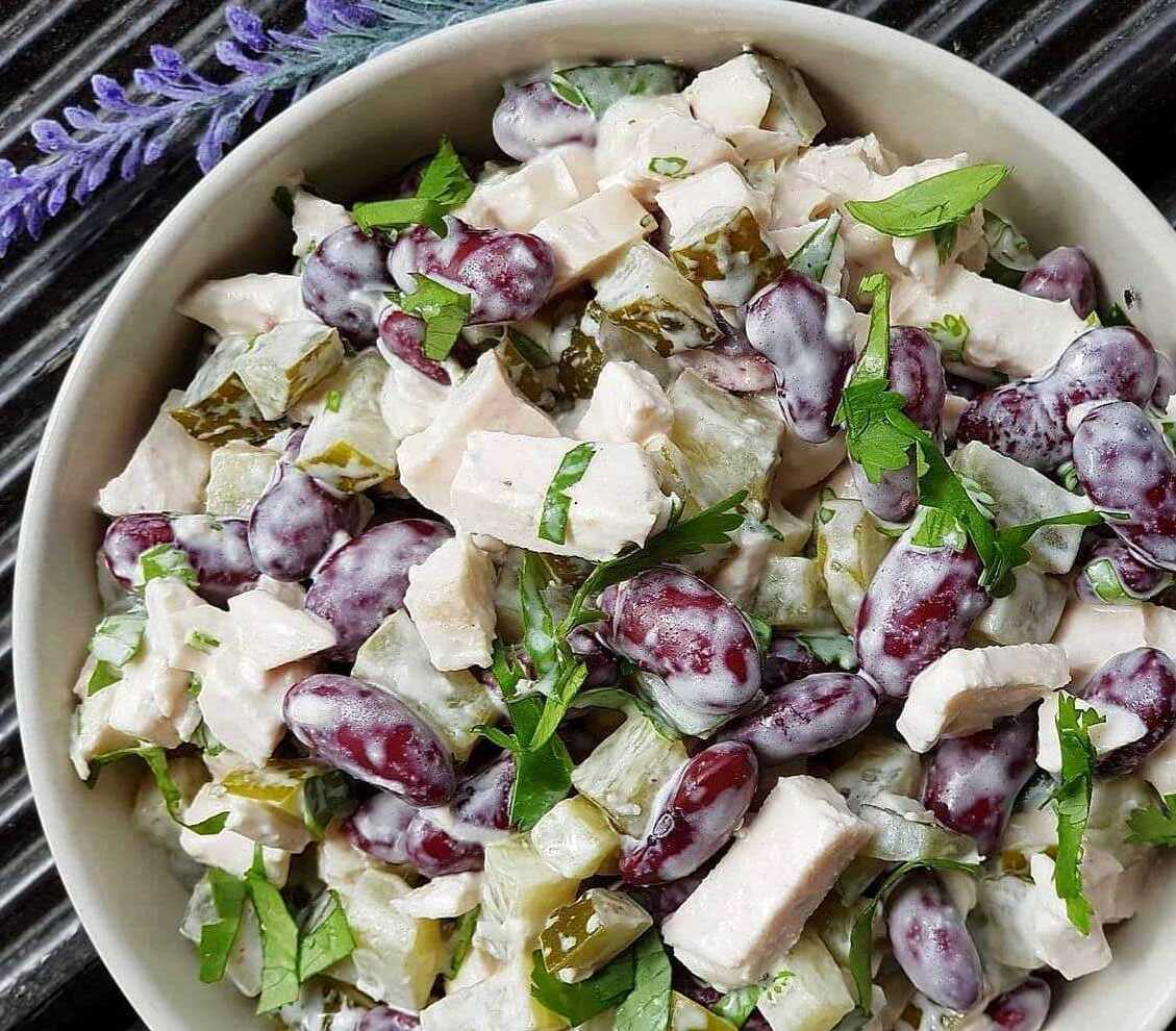 Ανακατέψτε το στήθος, τα αγγούρια και τα φασόλια σε κονσέρβα.