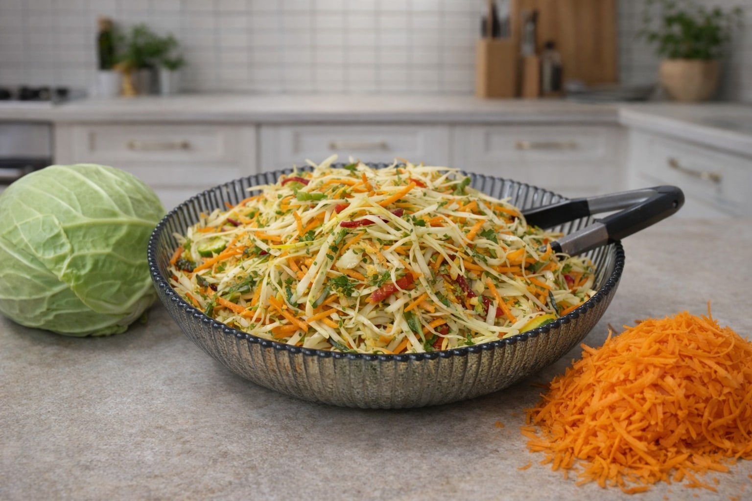 Αν νομίζεις ότι η Σαλάτα με λάχανο είναι απλώς ένα “συνοδευτικό”, αυτή η συνταγή θα σου αλλάξει γνώμη. Το μυστικό δεν βρίσκεται μόνο στα φρέσκα, τραγανά λαχανικά, αλλά σε μια σάλτσα λεμονιού και σκόρδου που δένει τα πάντα και κάνει τη σαλάτα… πρωταγωνίστρια στο τραπέζι.