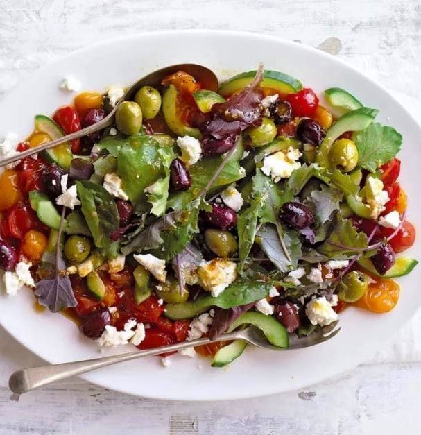 Σε ένα μπολ, ανακατέψτε το αγγούρι (κόψτε το κατα μήκος, βγάλτε τους σπόρους και στη συνέχεια κόψτε τους σε μισοφέγγαρα), τα φύλλα μαρουλιού και τις ελιές με το δεντρολίβανο και μαύρο πιπέρι με τη φέτα και βάλτε στο πιάτο με τα ντοματίνια. Χρησιμοποιήστε μια λαστιχένια σπάτουλα για να ξύστε
