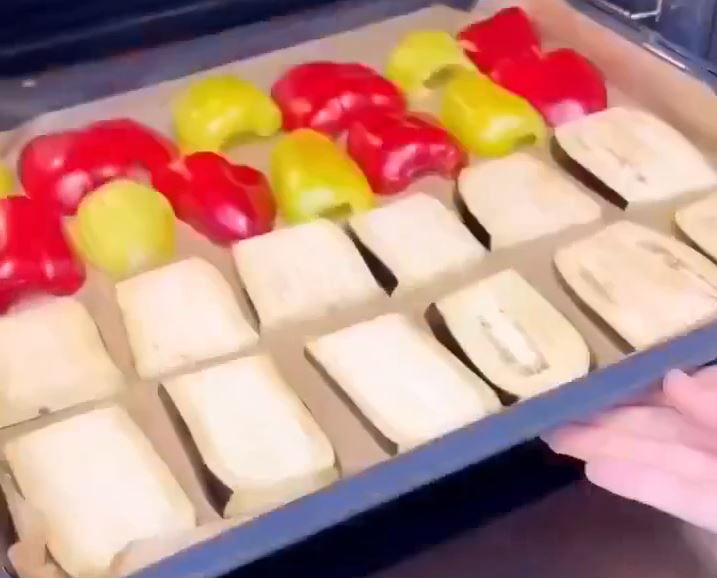 Προετοιμάζω τα λαχανικά καθαρίζοντας τις πιπεριές από τα σποράκια και τις κόβω στη μέση. Επίσης, κόβω και τις μελιτζάνες στη μέση και μετά σε φαρδιούς πλαστούς. Τα βάζω σε ένα ταψί στρωμένο με αντικολλητικό χαρτί.