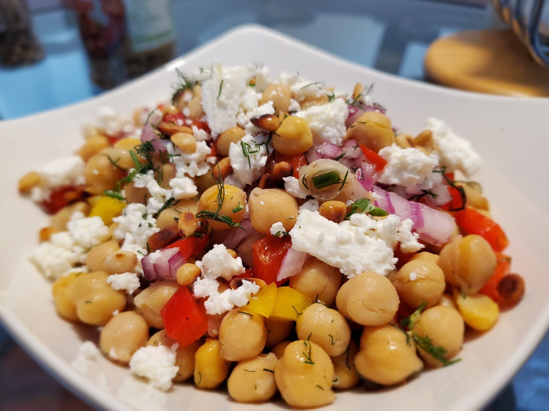 Ψιλοκόβουμε τον άνηθο και τον προσθέτουμε μαζί με τις πιπεριές κομμένες σε κύβους, προσθέτουμε τα ρεβίθια και ανακατεύουμε όλα μαζί.