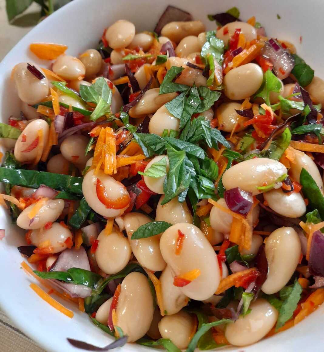 Σαλάτα με Λευκά φασολια με κόκκινο κρεμμύδι, καρότα, κόκκινη πιπεριά, μαϊντανό, σπανάκι και φύλλα δυόσμου