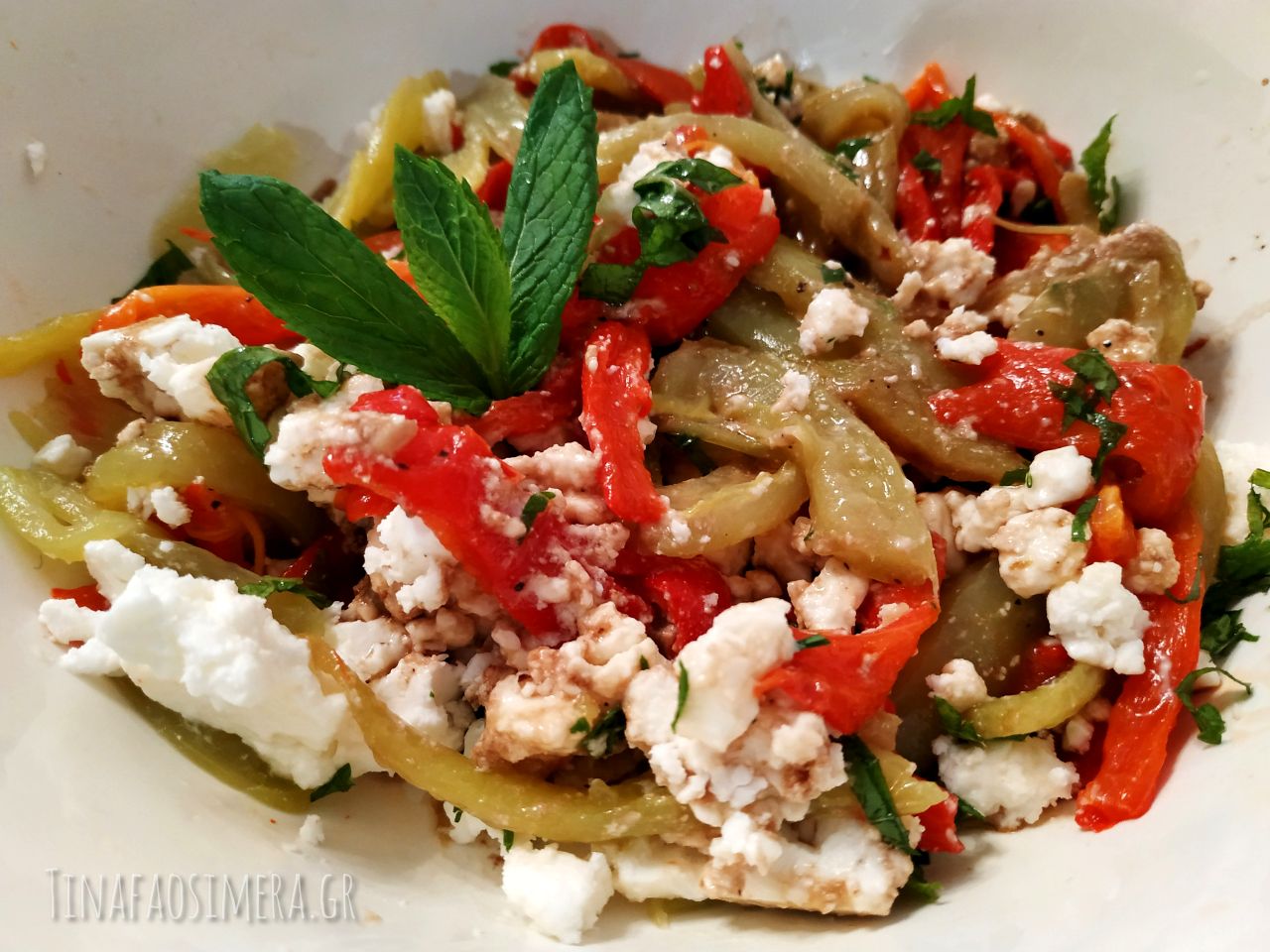 Αφού κρυώσουν, τις καθαρίζουμε. Αφαιρούμε το κοτσάνι και τα σπόρια και τις κόβουμε σε λεπτές λωρίδες. Τις βάζουμε σε μια σουπιέρα ή μια πιατελίτσα. Ρίχνουμε τον δυόσμο και τη φέτα.