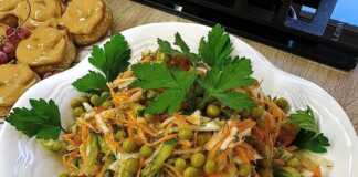 Σε μία κατσαρόλα βράζουμε στήθος κοτόπουλο . Προσθέτουμε ένα κρεμμύδι καρότο αλατοπιπερώνουμε. Όταν βράσει αφήνουμε να κρυώσει μέσα στο ζωμό. Ύστερα κόβουμε πολύ ψιλά μετά προσθέτουμε όλα τα υλικά που είναι γραμμένα πάρα πάνω.