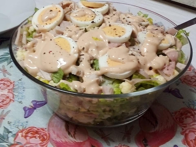 Μετά κόβουμε τα αυγά μας σε φετες και τα προσθέτουμε και αυτά γύρω-γύρω στη σαλάτα και στο τέλος από πάνω σε όλη την επιφάνεια απλώνουμε το dressing και η σαλάτα μας είναι έτοιμη