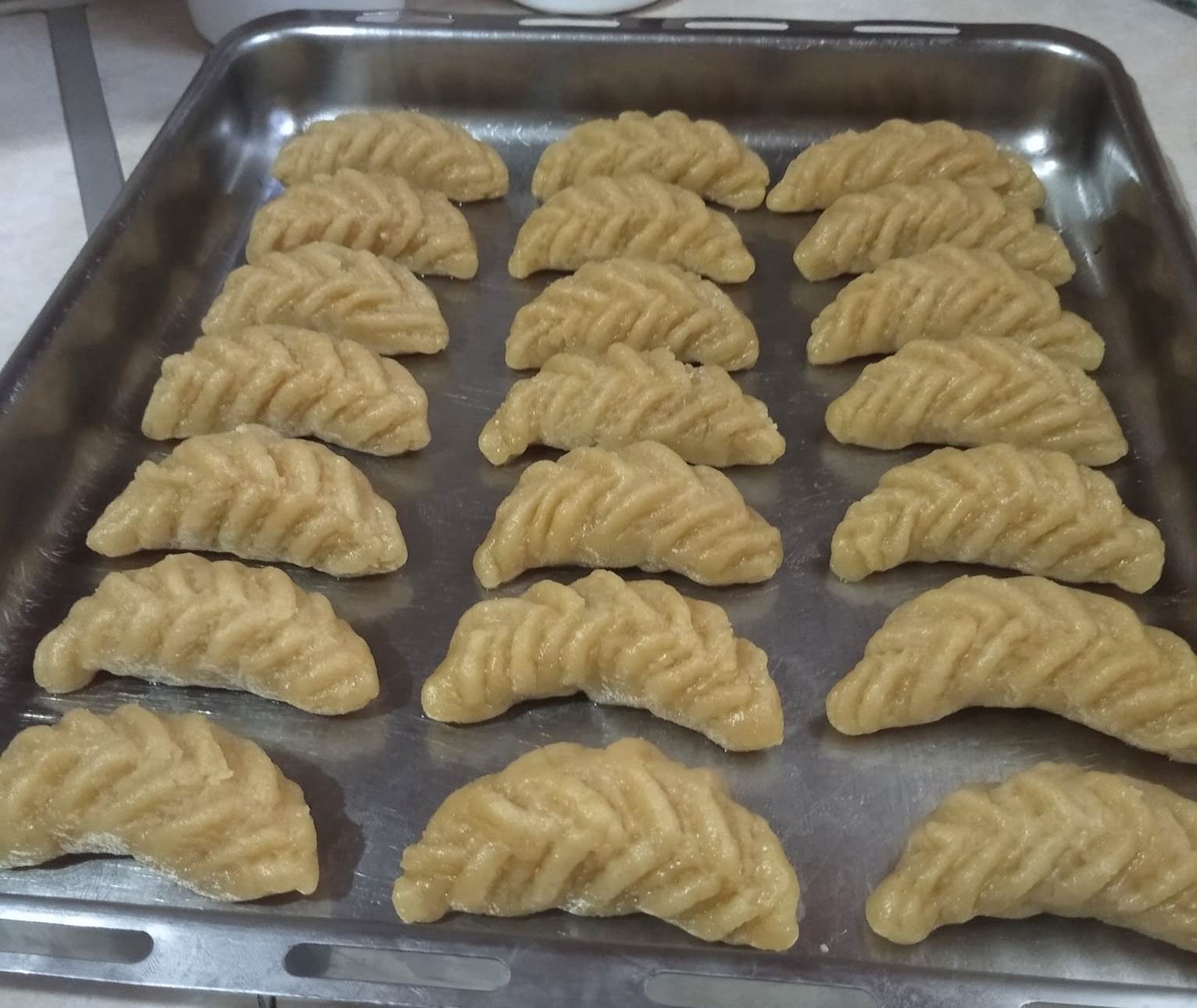 Παίρνουμε μικρά κομμάτια από τη ζύμη, τα πλάθουμε σε μπαλίτσες και τα ανοίγουμε ελαφρά με τα δάχτυλα.