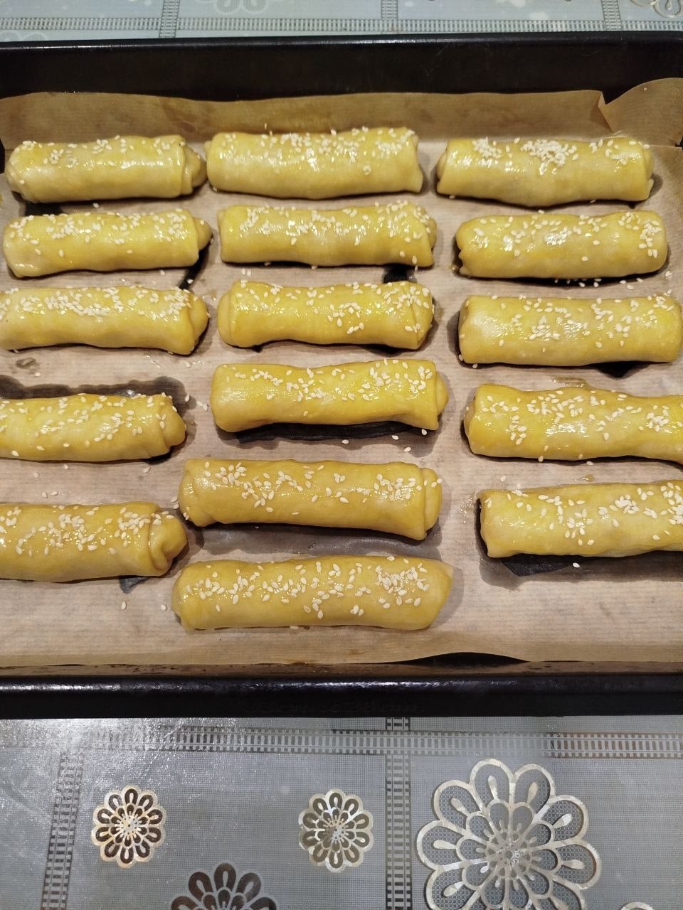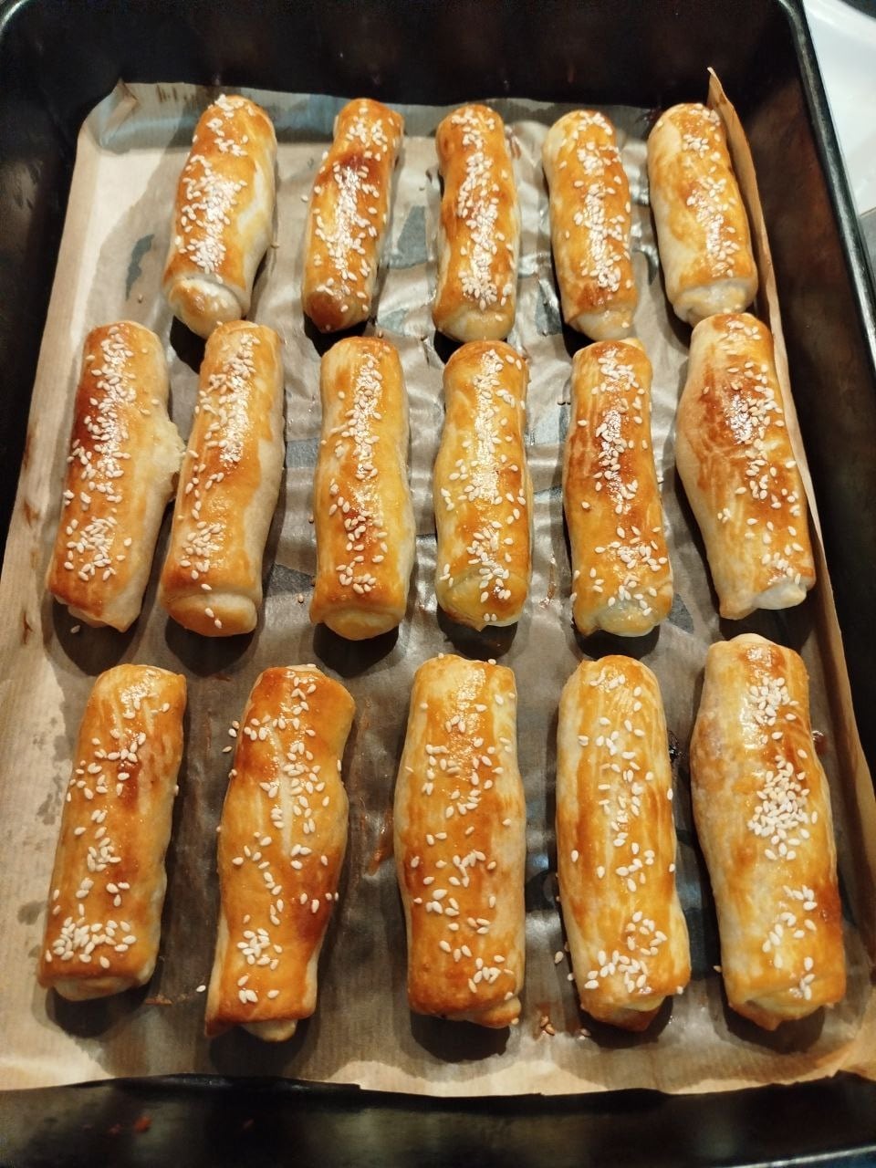 4. Τύλιγμα: Τυλίγουμε σε σχήμα σωλήνα διπλώνοντας τις άκρες προς τα μέσα για να μην φύγει η γέμιση. Αλείφουμε αν θέλουμε με λίγο ζαχαρόνερο και πασπαλίζουμε με σουσάμι.