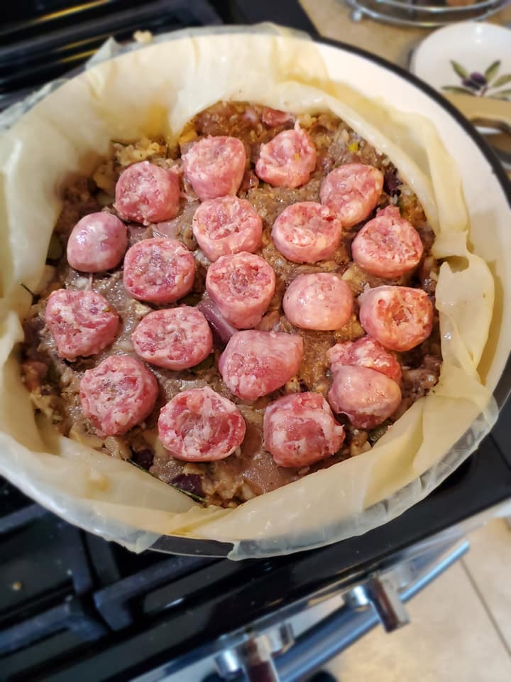 Περιχύνουμε το μπέικον με το μείγμα του κρέατος και όλα τα πρόσθετα. Τοποθετήστε το λουκάνικο από πάνω (στη φωτογραφία).