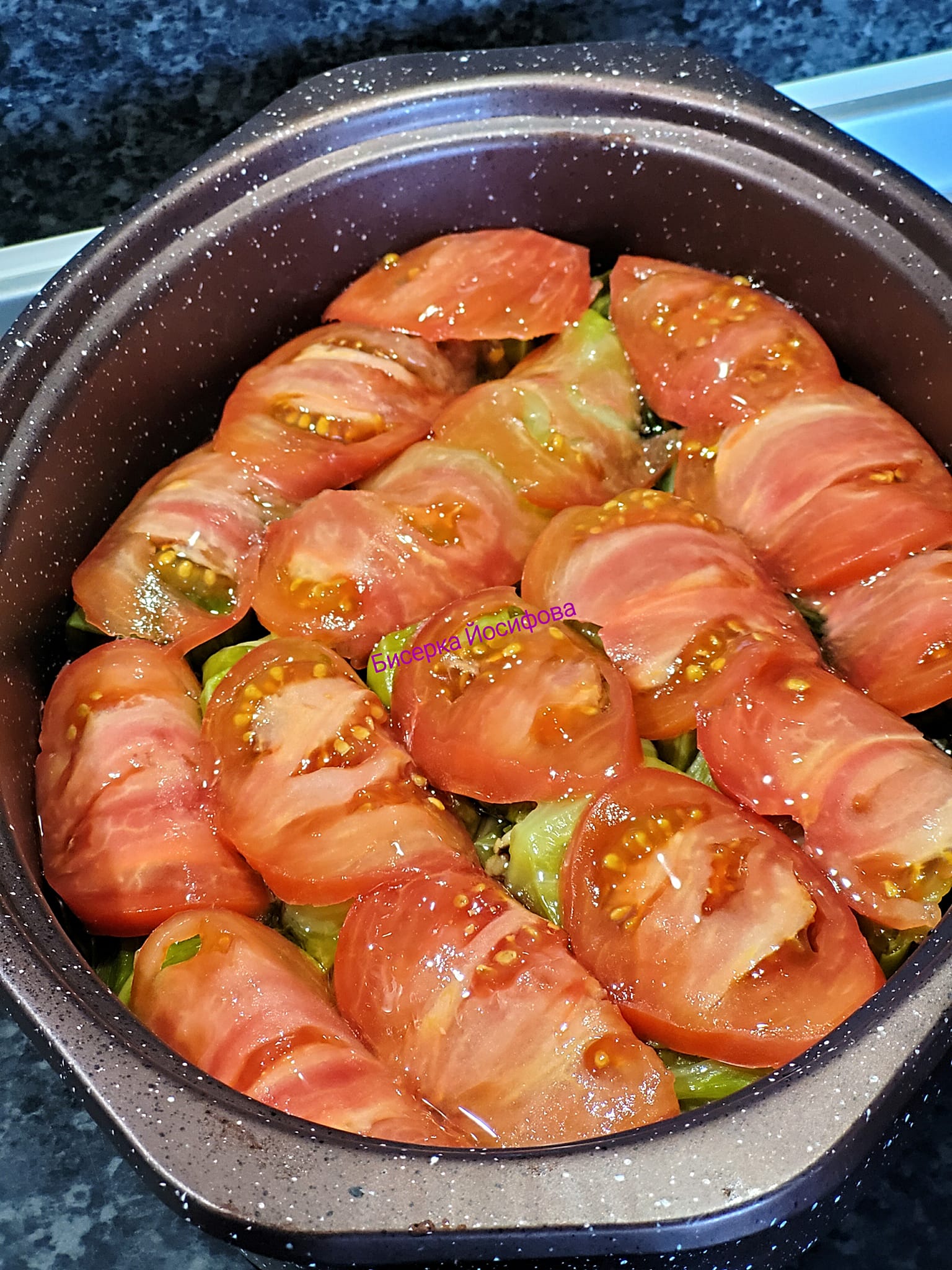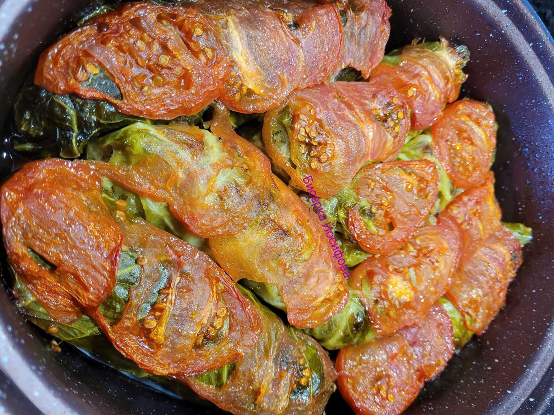 Τοποθετείτε τους σαρμαδες στο ταψί. Aπό πάνω απο κάθε σαρμά βάζετε λεπτές φέτες ντομάτας