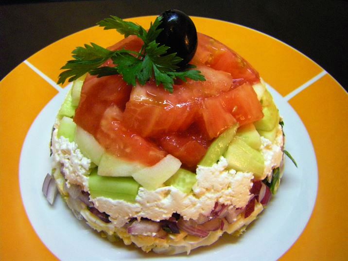 Πιέστε κάθε στρώση. Αφήστε τις σαλάτες στο ψυγείο για περίπου 40-50 Πριν από το σερβίρισμα, γυρίστε τις σαλάτες σε κατάλληλες πλάκες, γαρνίρετε με ελιές και φύλλα μαϊντανού.