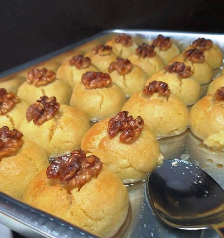 Αραδιάζουμε σε ταψί λαδωμένο με βούτυρο, σε απόσταση μεταξύ τους. Σε κάθε ένα, βάλτε ένα μισό Καρυδι. Ψήνουμε σε προθερμασμένο φούρνο στους 180 βαθμούς μέχρι να ροδίσουν.