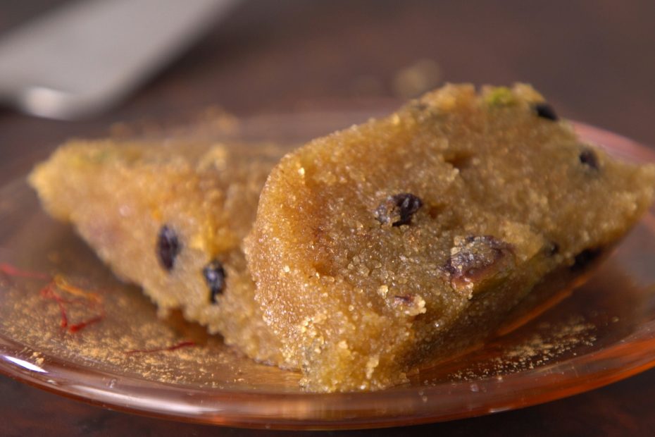 Ζεσταίνουμε το ελαιόλαδο σε μια κατσαρόλα σε μέτρια φωτιά και προσθέτουμε το σιμιγδάλι. Μαγειρέψτε, ανακατεύοντας, έως ότου το σιμιγδάλι αρχίσει να καφέτιζει ελαφρά. Αυτό θα διαρκέσει περισσότερο από ό, τι νομίζετε! – Περίπου 12 με 15 λεπτά. Σε εκείνο το σημείο, σε χαμηλή φωτιά, χρησιμοποιώντας μια κουτάλα και με το πρόσωπό σας μακριά από το άνοιγμα της κατσαρόλας, προσθέστε πολύ αργά το σιρόπι στο μείγμα σιμιγδαλιού, ανακατεύοντας δυνατά με την κουτάλα. Προσθέστε τα καρύδια, την κανέλα, τις σταφίδες και το ξύσμα πορτοκαλιού. Συνεχίστε να ανακατεύετε το μείγμα χαλβά σε χαμηλή έως μέτρια φωτιά για άλλα 15 λεπτά περίπου, μέχρι να κολλάει και να βγαζετε το περιεχόμενο της κατσαρόλας από τις πλευρές. Βγάλτε το από την φωτιά και με το κουτάλι βάλτε σε μία φόρμα για κεικ ή οπου αλλού θελετε να πάρει την φόρμα του. Καλύψτε με μια πετσέτα κουζίνας και αφήστε το χαλβά σε θερμοκρασία δωματίου. Τότε μπορείτε να το ψήσετε ή να το σερβίρετε σε θερμοκρασία δωματίου.